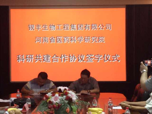 2014年7月8日,銀豐生物集團(tuán)與河南省醫(yī)藥科學(xué)研究院合作協(xié)議簽約儀式在鄭州市隆重舉行,生物集團(tuán)總裁生德偉與河南省醫(yī)藥科學(xué)研究院院長(zhǎng)楊波共同簽署了共建協(xié)議。河南省科技廳社發(fā)處處長(zhǎng)楊光、鄭州大學(xué)副校長(zhǎng)???biāo)、別榮海、科技處處長(zhǎng)趙明皞受邀參加簽約儀式。楊光處長(zhǎng)在儀式上發(fā)表重要講話(huà),介紹了目前科技部在各省設(shè)立人類(lèi)遺傳資源庫(kù)的政策,表示銀豐生物集團(tuán)與河南省醫(yī)藥科學(xué)研究院強(qiáng)強(qiáng)聯(lián)手共建河南省人類(lèi)遺傳資源庫(kù)是利國(guó)利民的好事,科技廳將給予大力支持。